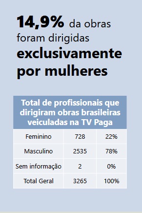 Elaborado pela coordenação de Monitoramento de TV Aberta e Paga da Superintendência de Análise de Mercado da Ancine, o recente estudo aponta um resultado alarmante marcado por grande desigualdade. Apenas 14,9% foram dirigidas exclusivamente por mulheres, como podemos notar logo abaixo.