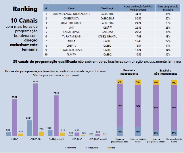 Outro ponto triste apresentado é que apenas 10 canais, são eles: Curta! O Canal Independente, CineBrasilTV, Prime Box Brazil, GNT, Canal Brasil, TV Rá Tim Bum, Arte 1, Chef TV, como pode ser visto logo a seguir, exibem obras com direção exclusivamente feminina, enquanto outros 28 não constaram nenhuma obra.