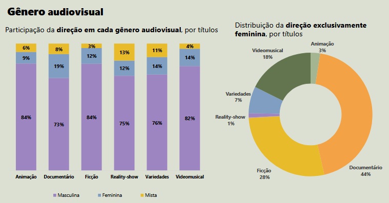 O estudo também mostra a participação feminina na direção por gêneros audiovisuais, possibilitando uma melhor visão dessas produções, sendo que 9% são obras de animação, 12% ficção e reality-show, 14% são variedades e videomusical e o documentário acaba destacando entre elas, com 19%.